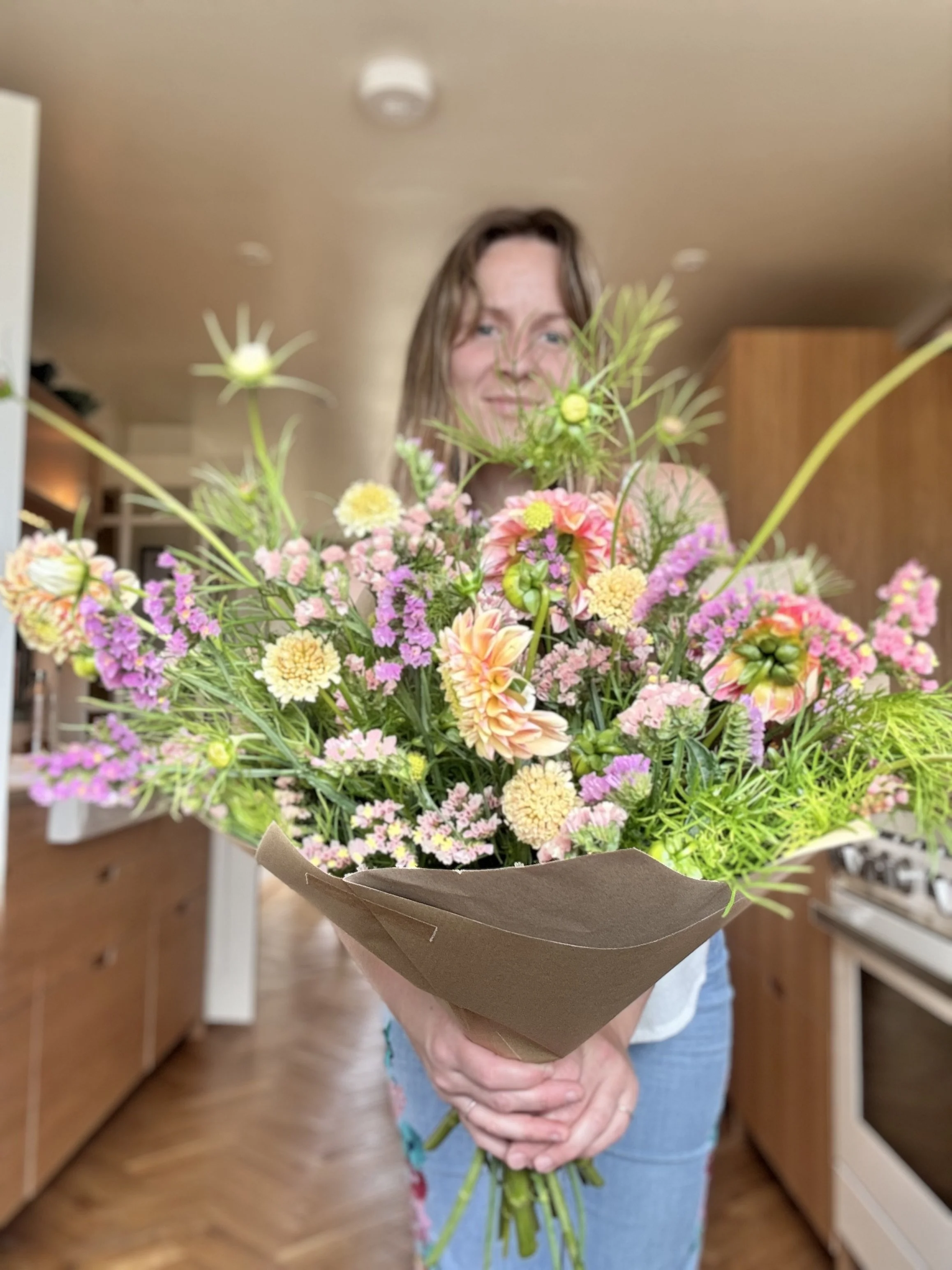 I literally grow all my flowers in a small plot just down the road from my home, harvest them by hand, and bring them back to my kitchen to process and create beautiful arrangements. Every bouquet is personally handled from stem to wrap, giving each one a truly artisan touch.