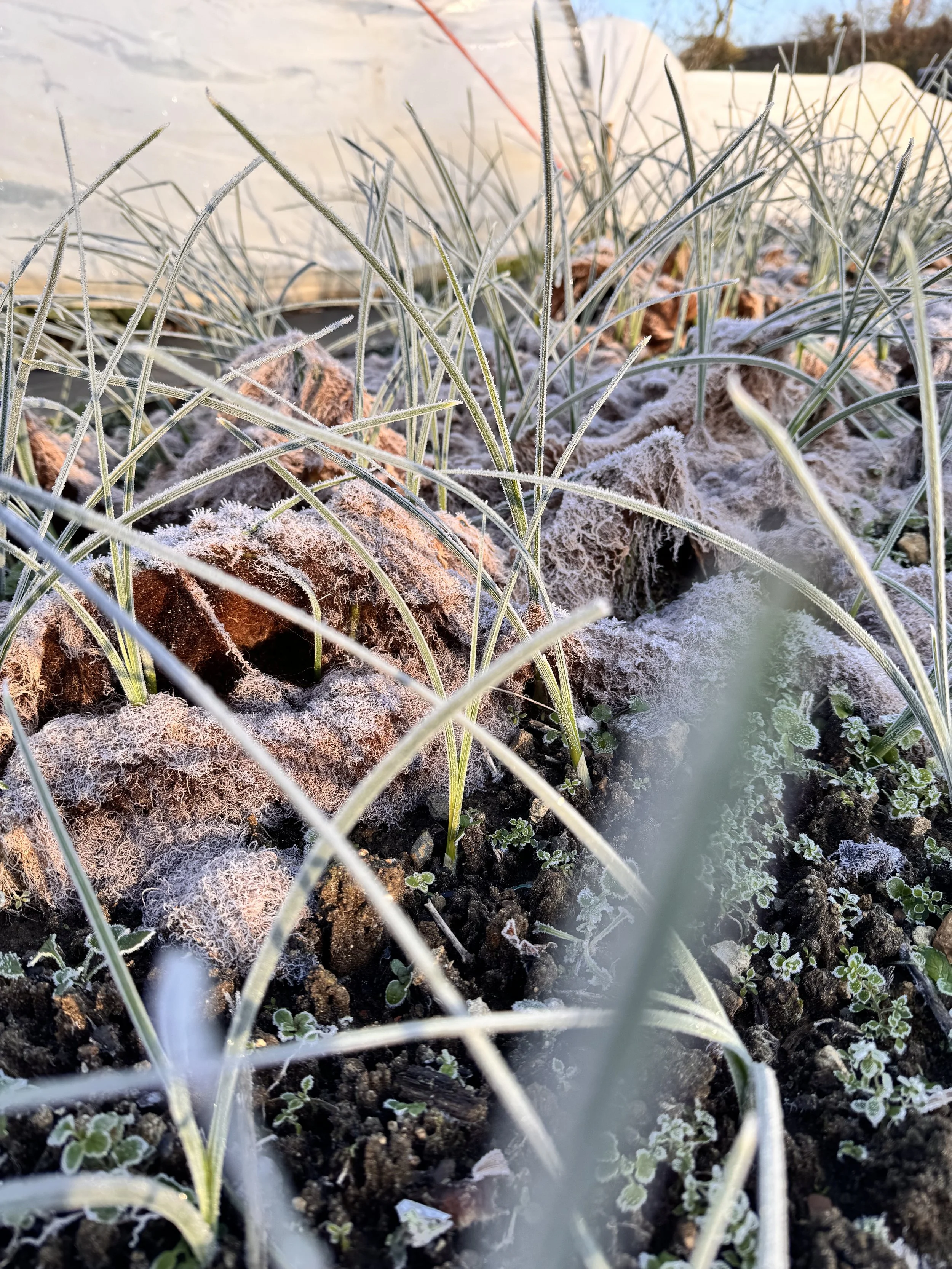 There’s something magical about the farm when the frost arrives. Every morning, the flowers sparkle with tiny ice crystals, turning the beds into a glittering wonderland. Even the smallest leaves look like they’ve been dusted with fairy dust.